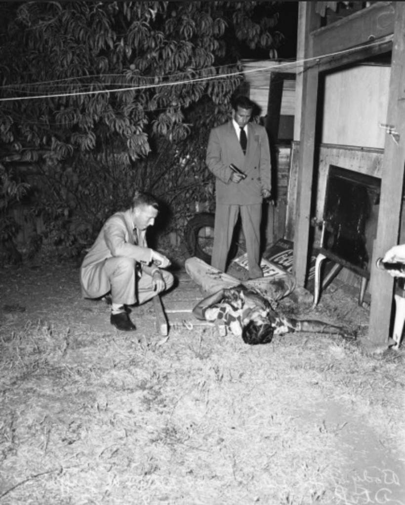 The top photo shows an LAPD policewoman named Florence Coberly, who in a dangerous undercover operation, was asked to lure a serial rapist named Joe Parra. This would require placing herself in harm’s way so police could catch him just before the act. Supported by more than thirty cops hidden in unmarked cars and stationed around the neighborhood, Coberly did exactly that, drawing the suspect, which in turn drew her backup. Parra tried to run, and photo two shows him after he was gunned down. These shots are from 1952, a year at the end of which she would win the LAPD’s Policewoman of the Year award.