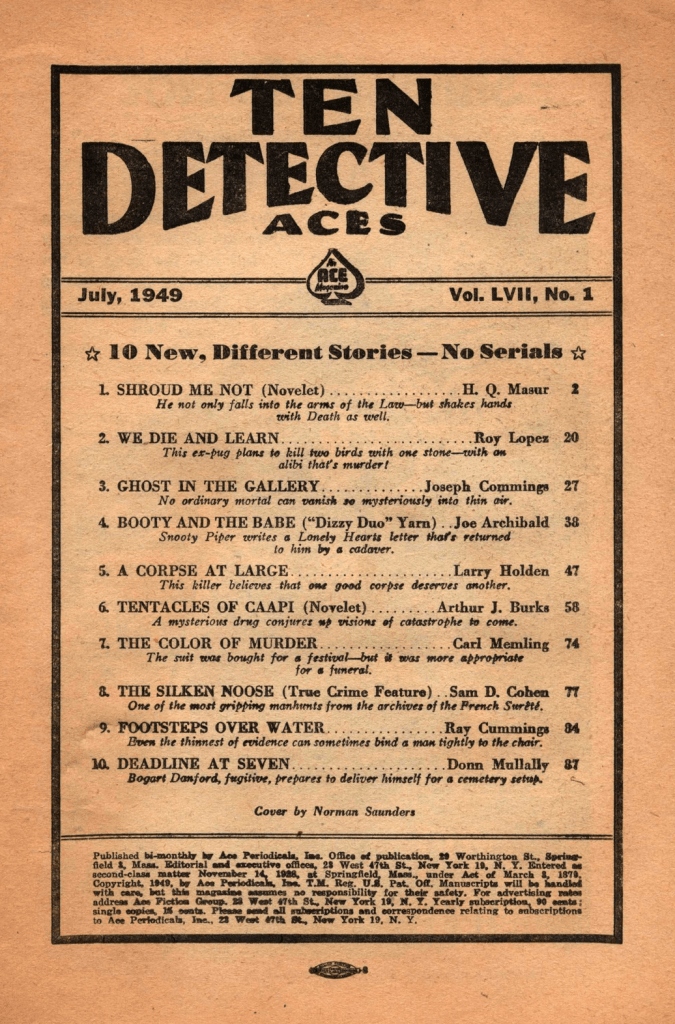 ~ Roger Torrey, “Concealed Weapon”, ‘10 (of 14) in Pat McCarthy series, with Marge Chalmers often his “sidekick”; he is ex-NYC cop, ex-agency man (Chicago & St. Louis) who dislikes cops’, reprinted in The Black Lizard Big Book of Pulps (Vintage, 2007), 37th of 50 appearances in BM
