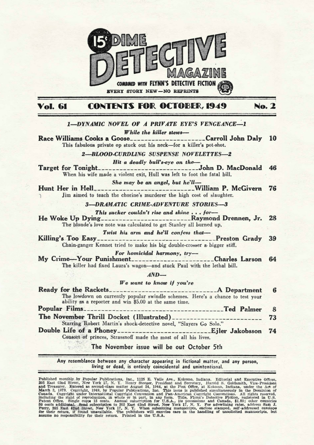 ~ Raoul [Fauconnier] Whitfield, “Walking Dynamite”, 2nd of 3 stories with PI Don Free, 2nd story in this issue by RFW, 58th of 68 stories in BM [see also 24 stories as Ramon Decolta]