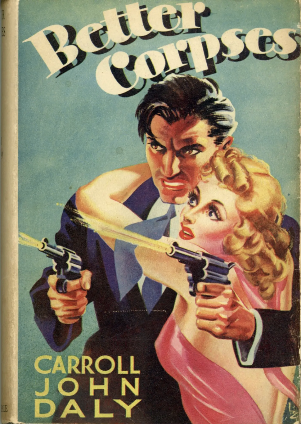 Daly, Carroll John. BETTER CORPSES: A RACE WILLIAMS STORY. London: Robert Hale Limited, [1940]. Octavo, pp. [1-6] 7-286 [287-288: blank], publisher’s black cloth stamped in red and silver. First edition. “When better corpses are made, Race Williams will make them” (p. 186). The last Race Williams book, a fix-up novel incorporating the three-part Morse story arc that first appeared in DIME DETECTIVE in 1935 and 1936 featuring Daly’s violent tough-guy detective, Race Williams, who “never bumped off a guy what didn’t need it” and the Flame (The Girl with the Criminal Mind), “a woman of good — a woman of evil. Take your choice.” Carroll John Daly (1889-1958), one of the fathers of the modern hard-boiled private eye and an important BLACK MASK writer, “is not known for literary niceties — his style can best be described as crude but effective … Characterization is minimal and action is everything” (Crider and Pronzini). Race Williams was Daly’s most successful creation, appearing in about 70 stories and eight novels. Lee Server (Encyclopedia of Pulp Fiction Writers, 2014) has called Race Williams “the single most popular private eye in the history of the pulps.” Cloth worn and scuffed, slight spine lean, half title leaf and final blank tanned, a sound, good copy in a pictorial 8/3 dust jacket with touch of wear at edges, mainly lower spine end, and mild tanning to spine panel and along rear flap fold. Stunning jacket. From the library of a well-known mystery writer with his library stamp on the front paste-down. Rare. There is no equivalent U.S. edition.